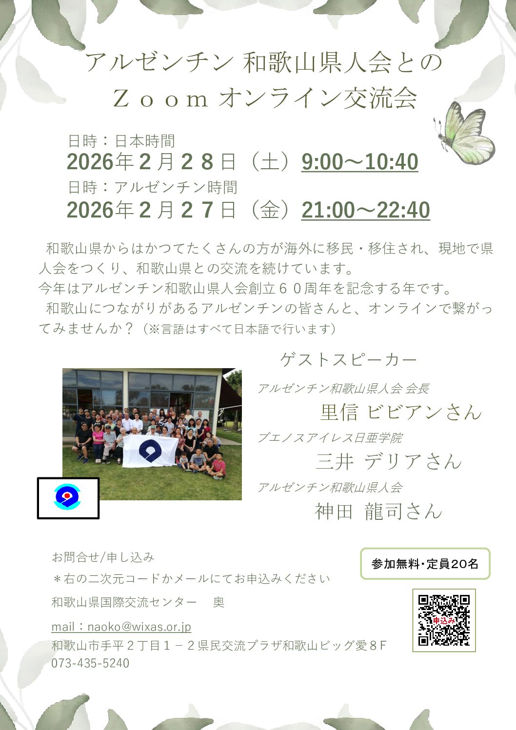 2026.2.28(土)9:00~10:40 アルゼンチン和歌山県人会とのZoomオンライン交流会