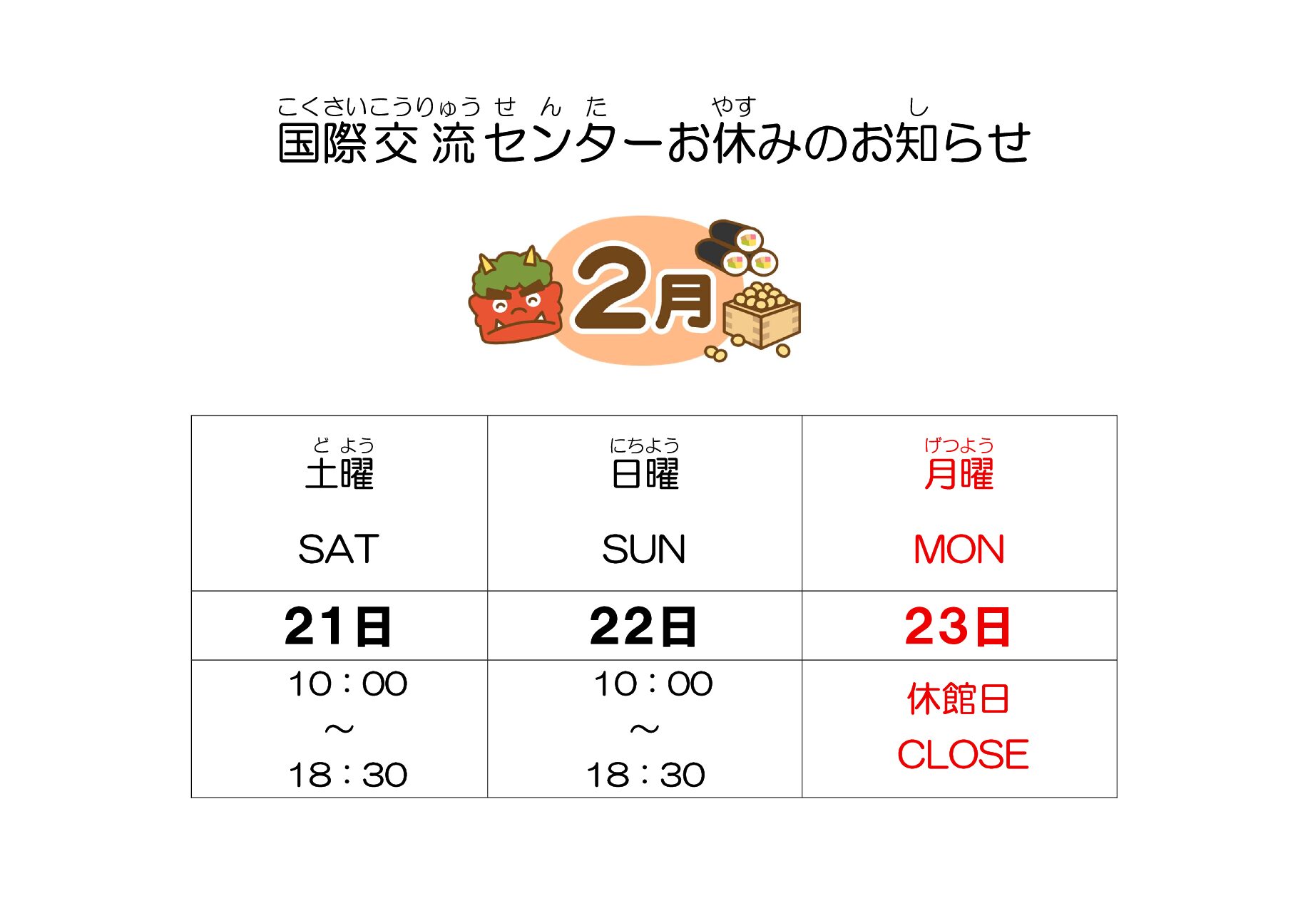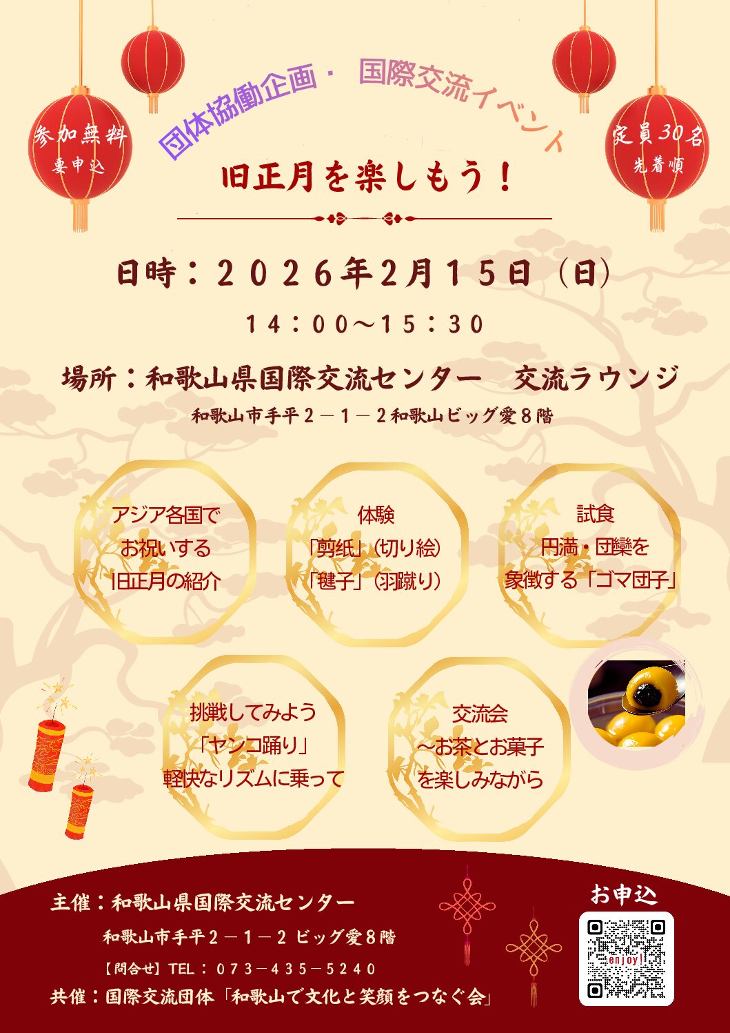 団体協働企画・国際交流イベント「旧正月を楽しもう!」 日時:2月15日(土)14:00~15:30 アジア各国でお祝いする旧正月や春節を体験してみませんか。 お申込は、https://forms.gle/AnMxz19D […]